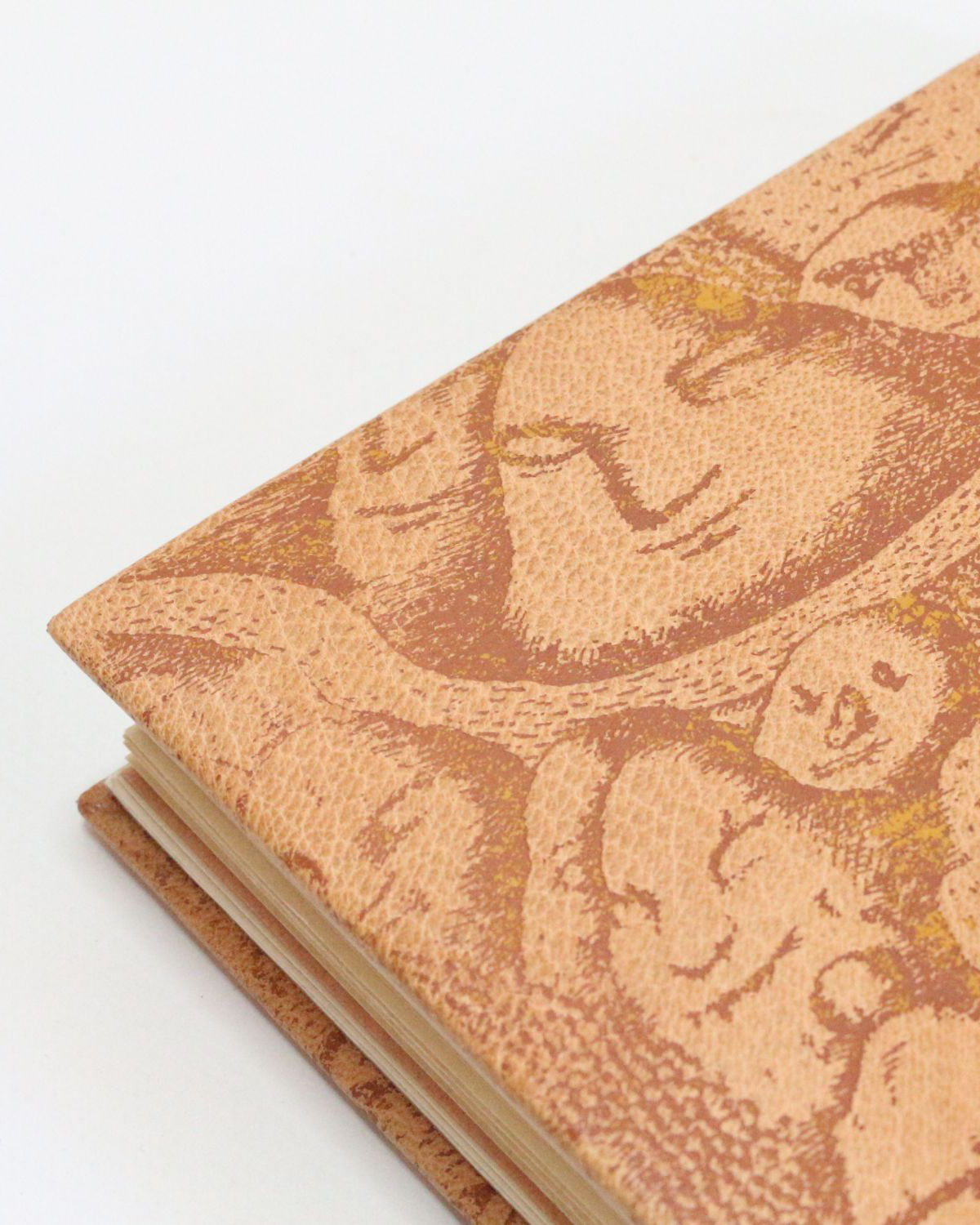 Reliure en plein oasis havane, dos lisse, plats et dos ornés d'un décor onirique de montagnes humanisées d'après un dessin de Peter Sis estampé à l'oeser brun et enrichi de rehauts ocre, contreplats de daim bleu ciel, gardes de daim noisette, première garde ornée d'un rond de peau bleu ciel modifié à l'oeser, couvertures et dos conservés ; étui en demi oasis havane, plats de cartonnage façon bois, intérieur de daim noisette, spectaculaire ensemble signé de Morina Mongin.