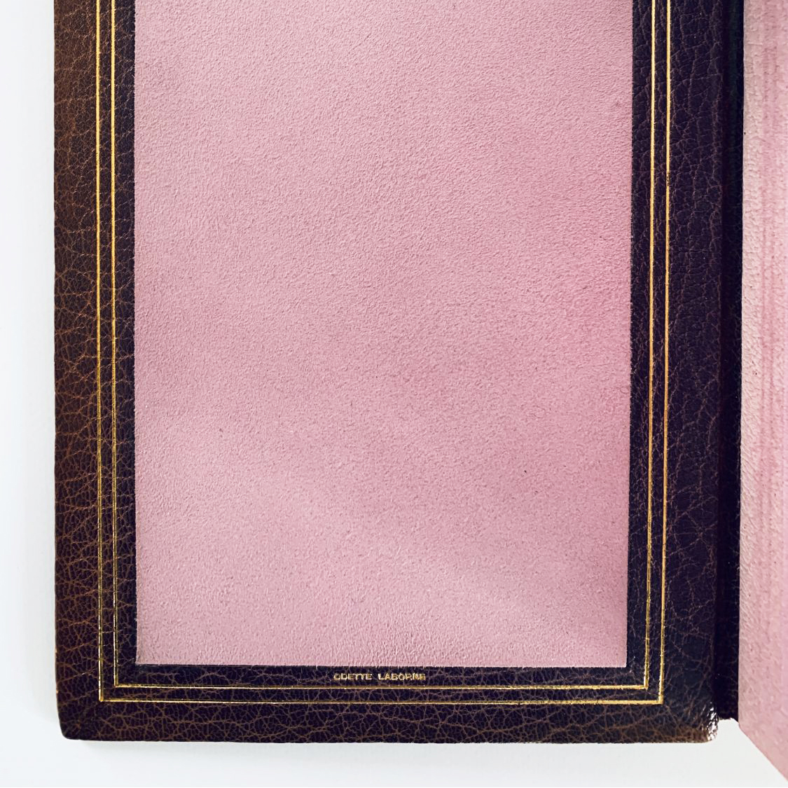 Reliure en plein maroquin parme d'époque signée Odette Laborne sur le contreplat. Dos lisse orné de fers décoratifs complexes, doublé sur le tome Au jardin de l'infante. On retrouve ce fer dans une composition losangé sur les plats. Contreplats de velours rose. Tête dorée. Dos insolés ayant viré au brun. Traces de frottement sur le dos. Les couvertures illustrées et les dos ont été conservées. Exemplaire parfaitement frais, à grandes marges.