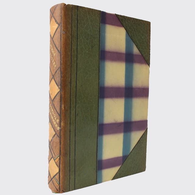 Reliure en demi maroquin vert olive à coins, dos lisse décoloré et éclairci orné de pièces de maroquin mosaïqué brun er vert formant des compostions géométriques à base de losanges, filets noirs sur les plats de papier marbré à motifs géométriques, gardes et contreplats de papier à la cuve, tête dorée, couvertures et dos conservés, étui en plein cartonnage souple recouvert de papier marbré à motifs géométriques, reliure belge de l'époque signée de R. Beenkens & fils.
