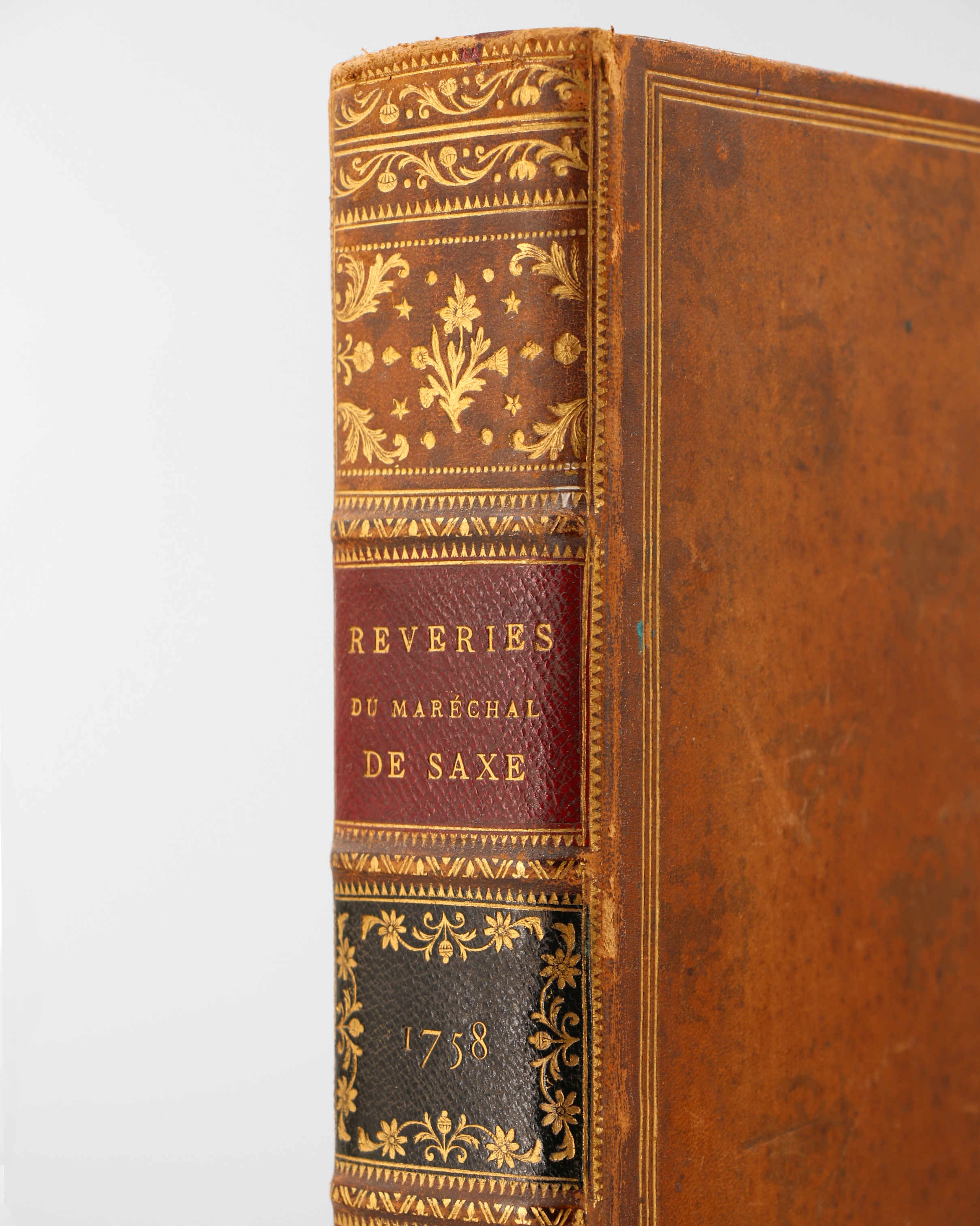 Seconde édition, réimpression de la première édition in-Folio en 1756 chez le même éditeur. Edition rare, illustrée de 40 planches dont 4 dépliantes et 16 sur double page (armes, costumes, plans, manoeuvres...). Grande vignette aux armes en page de titre, et 41 ornements (en-tête, culs-de-lampe). Page de titre en rouge et noir. In fine, Supplement aux Reveries, avec une page de titre spécifique, cette courte addition contient en quelques pages les corrections faites sur l'originale. Une édition en 2 volumes in-4 est parue à Paris en 1757.