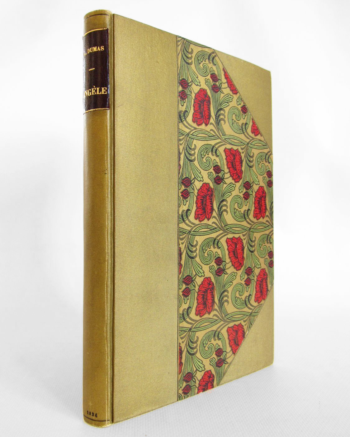 Reliure en demi percaline bronze doré à coins signée U. Zaugg ca 1880. Dos lisse. Pièce de titre de chagrin noir glacé. Papier aux coquelicots sur fond or. Tête dorée. Reliure réalisée sur brochure non rognée. Couvertures jonquilles conservées. Brunissures éparses. Traces de frottement en coiffes.