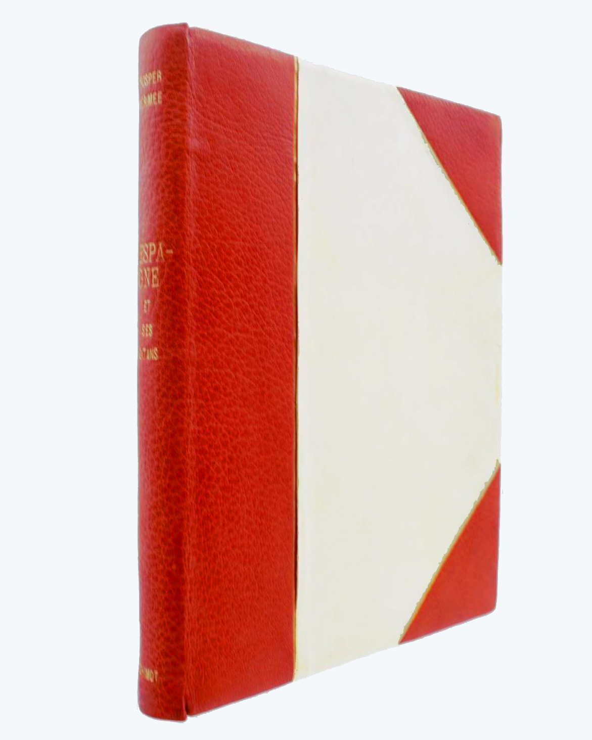 Reliure en demi maroquin rouge orangé à coins, dos lisse, nom doré de l'illustrateur en queue, encadrement de filets dorés sur les plats de papier façon vélin, gardes et contreplats de papier marbré, couvertures conservées, toute tranches dorées, étui bordé de maroquin rouge orangé, plats et intérieur de papier marbré, reliure signée Vassière relieur à Castres.